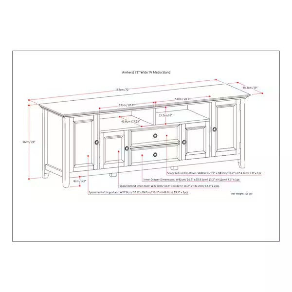 Having just purchased your dream large flat screen TV - you need the perfect TV Stand to enhance your viewing pleasure. Look no further. The Amherst TV Stand is perfectly sized for TV's up to 80 inches. The 26 inch height puts the TV at a level that is ideal for comfortable viewing. The Amherst TV Stand has plenty of storage and space for all your media and gaming devices. It has a large centrally located open area with two drawers as well as two enclosed spaces. The two large side storage cabinets open to one adjustable shelf each. The unit features cord management cut-outs for easy installation of TV and media components.