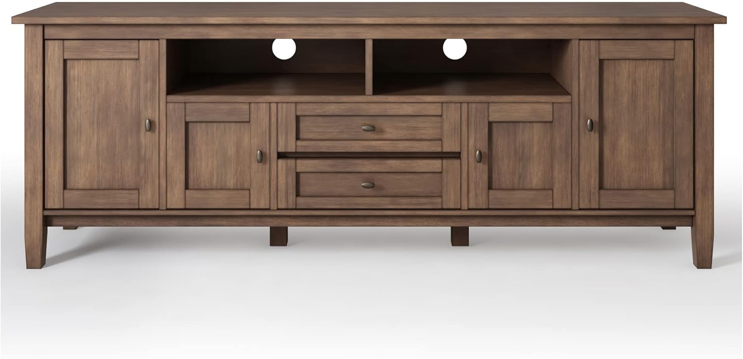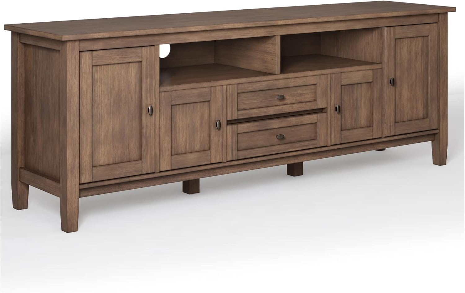 Now that 80 inch flat screen TVs are more affordable, you need to have one. To enjoy it fully, you will also need the perfect TV Stand to position your TV just right. Look no further. The Warm Shaker Extra Wide TV Stand is perfectly sized for TVs up to 80 inches. It has plenty of storage space for all your media and gaming devices. It has a large centrally located open area with two drawers as well as two enclosed spaces. The two large side storage cabinets open to one adjustable shelf each. The unit features cord management cut-outs for easy installation of TV and media components.