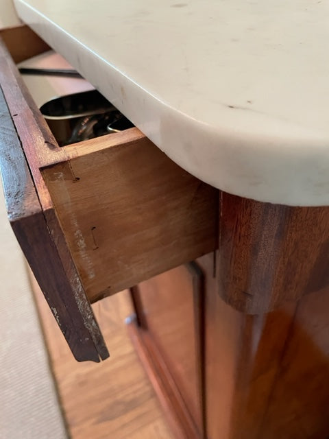 Condition: Good condition for age. See photos for split in wood on drawer.