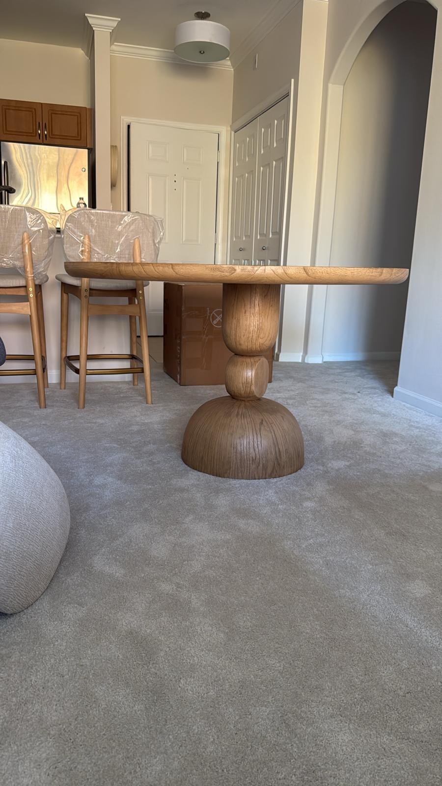 Brooke stands apart with its bold, rounded leg made of resin and wire-brushed finish for a natural wood look. Indulge in the elegance of the Castlery Brooke Round Wood Dining Table. Crafted with a wood round pedestal and uniquely rounded base, this premium table adds a touch of sophistication to any dining room. Elevate your dining experience with this luxurious and exclusive piece. Table Top: Engineered Wood with Solid Wood Mindi Edges; Legs: Resin