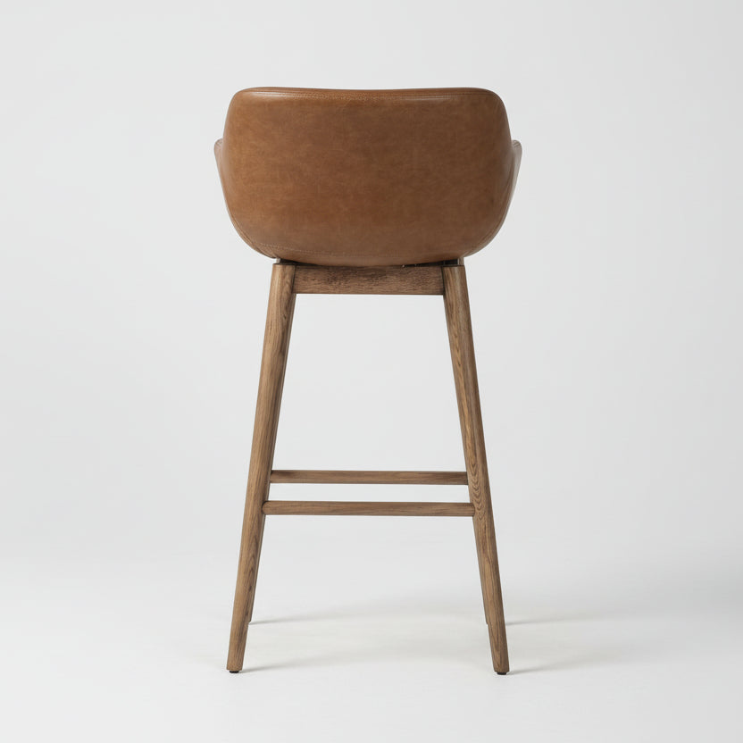This contemporary bar stool merges vintage aesthetics with modern functionality, featuring a responsive memory swivel mechanism paired with premium chestnut top-grain leather. The design showcases refined proportions—delicate tapered oak legs provide structural elegance while supporting a generously curved seat that prioritizes comfort and visual appeal.