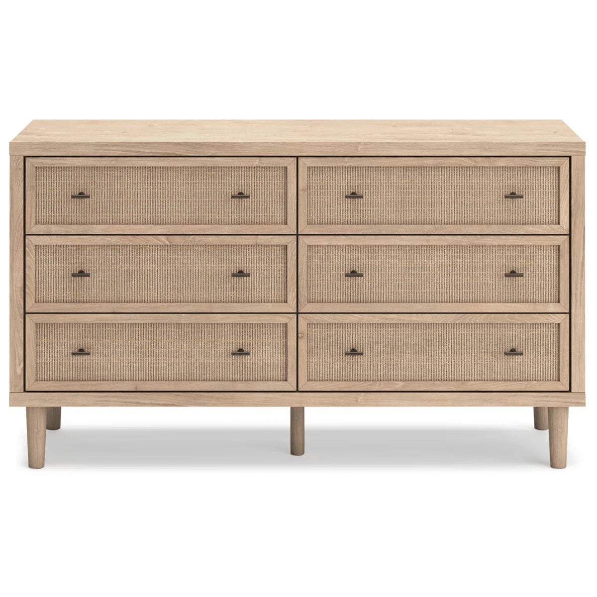 Clean-lined and contemporary—but far from stark—this dresser is a fresh style awakening. Pairing a light finish with replicated oak grain and textured beige cane details, its mixed materials bring a naturally versatile vibe to your bedroom. Sleek, simple hardware plays perfectly with the modern aesthetic. Prepare to have your mind blown by the vast universe of possibilities that await within the spacious drawers.