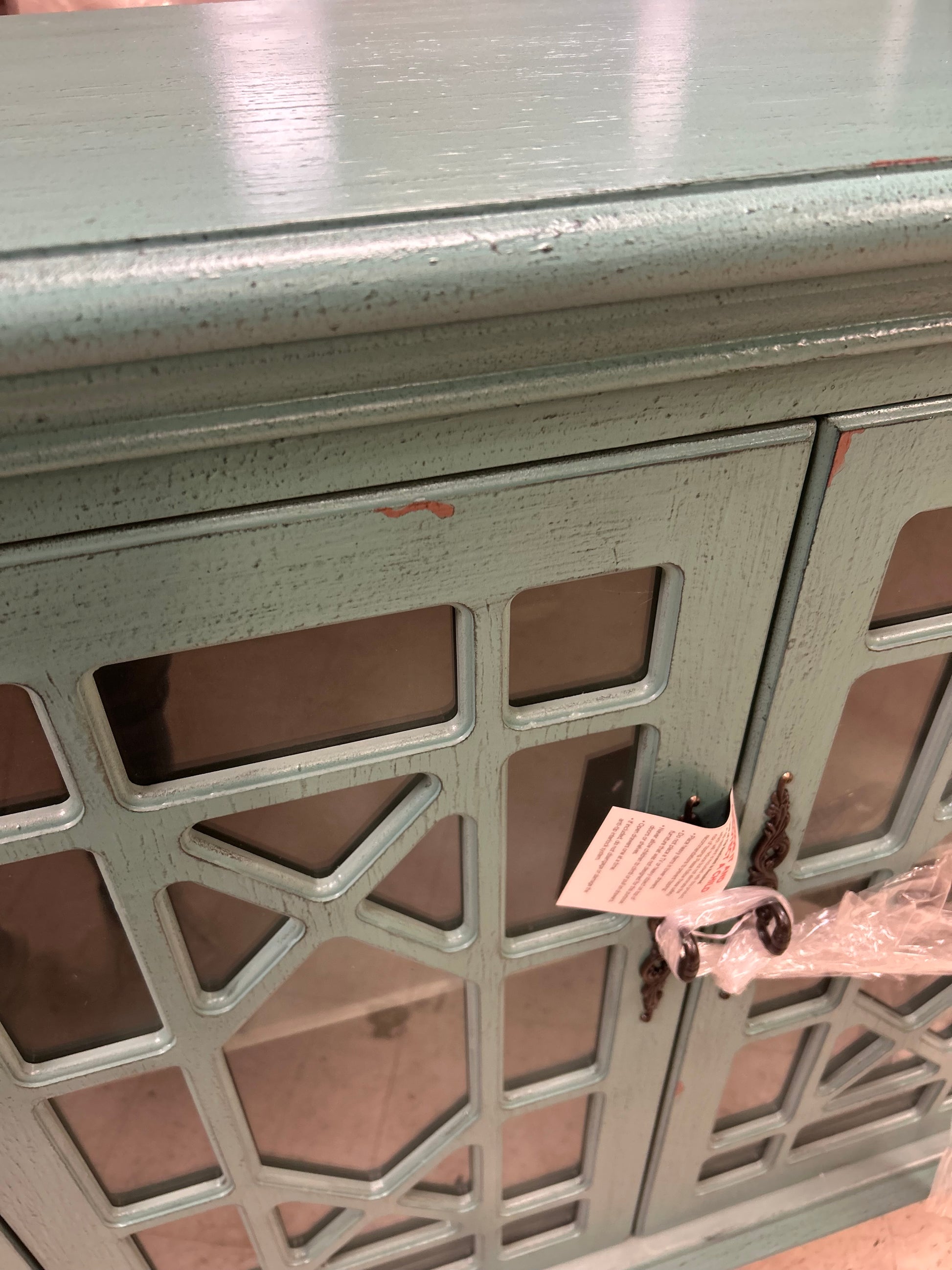 Bring a refined coastal touch to any living space or entryway with this wood credenza storage stand. Thoughtfully designed to accommodate flat-screen TVs up to 65", this versatile piece effortlessly combines visual appeal with practical storage. Crafted from a durable blend of solid poplar and engineered wood, the stand features a striking fretwork design over tempered glass-paneled doors — perfect for showcasing curated decor or concealing electronics and accessories. The durable wood construction ensures long-lasting stability while the distressed finish adds a pop of character to rustic, coastal, or transitional interiors. Inside, two spacious cabinets and shelves provide ample room for media components, books, or decorative items, keeping everything organized and easily accessible. Minimal assembly required.