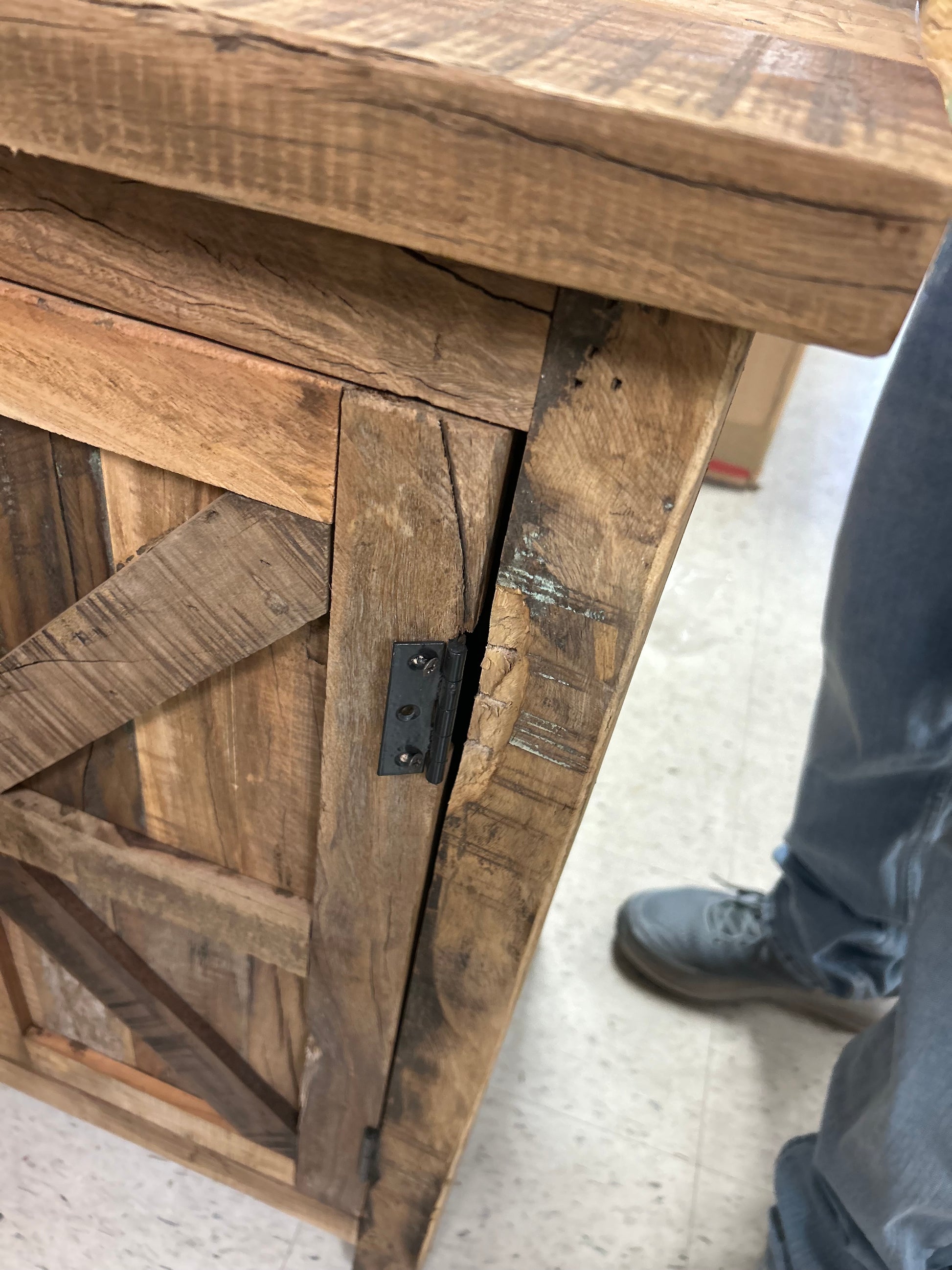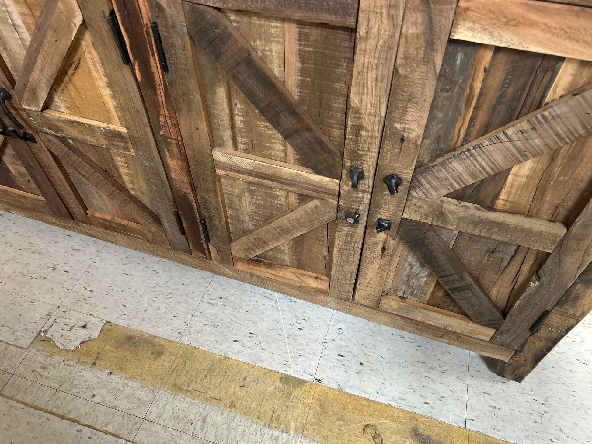 This sideboard has a salvaged look for a lodge-inspired addition to your living room or dining area. It's crafted from solid wood with a natural finish, and its reclaimed nature brings out the wood grain and shows off wormholes and knots. Plus, this credenza's barn-style paneling on the three sets of double doors brings an added dimension to the piece. Inside each cabinet is a shelf for dinnerware, seasonal décor, and much more. And at 84" wide, this buffet has heaps of room on top for a coffee station, record player, or an 88" TV. Wall anchor included.