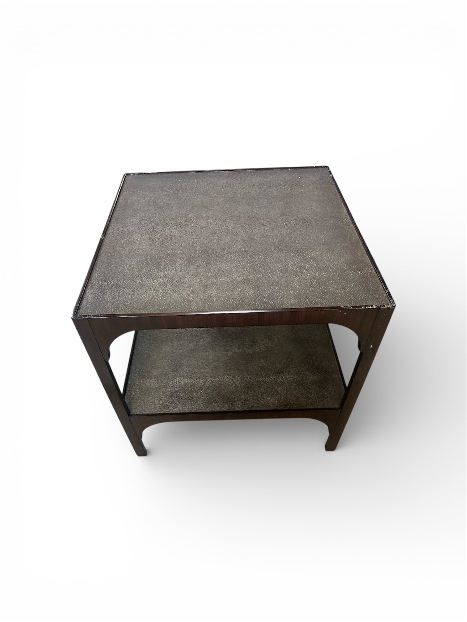 A square top is overlaid with faux resting above bracket aprons and squared corner legs over a low shelf. This end table crafted from walnut solids. Furniture and upholstery appearances can vary and are not guaranteed due to the inherent variation of all natural materials, including wood color, wood grain, leather, and stone material and finish. Upholstered seat heights may vary up to 1” due to crown variances and foam thickness. Product matches are not guaranteed if ordered at different times.