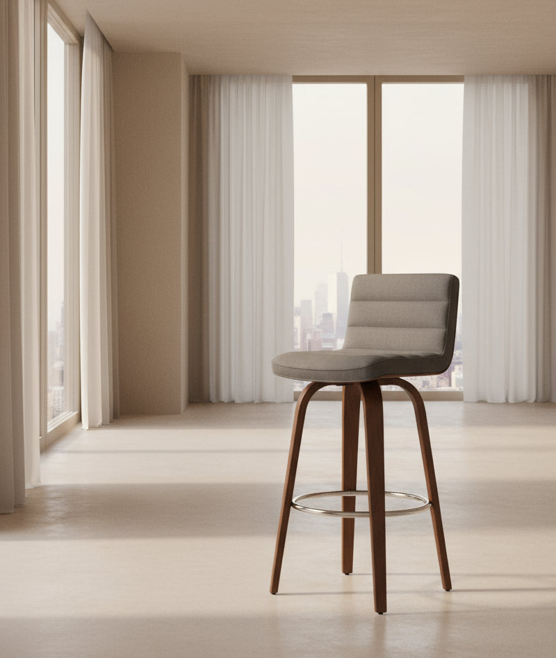 The contemporary, mid-century design of the Roland Swivel Counter Stool is a gem not to be missed. Featuring curved wood, this stool is guaranteed to make a statement in your kitchen, bar area or living space. The back and seat-cushion have been beautifully upholstered with durable fabrics that defines the very essence of style. Designed with care, this counter stool features a sturdy construction and a footrest to reinforce its strength. Don't forget that the seat swivels 360 degrees.