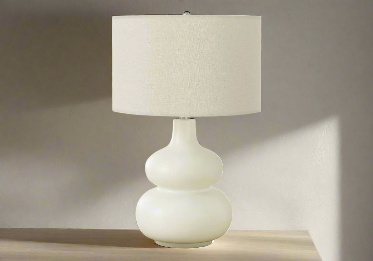 Embrace the good life with this hard working and stylish 25-inch cream ceramic gourd table lamp with cream drum shade. A gorgeous cream ceramic base brings just the right amount of pizzazz to this fabulous lamp. The cream shade has a drum shape and is made of linen, which makes it a perfect choice. This standard table lamp is designed to provide general lighting to the area. Use this lamp anywhere and elevate the look of the whole space. It is perfect for virtually any decor.