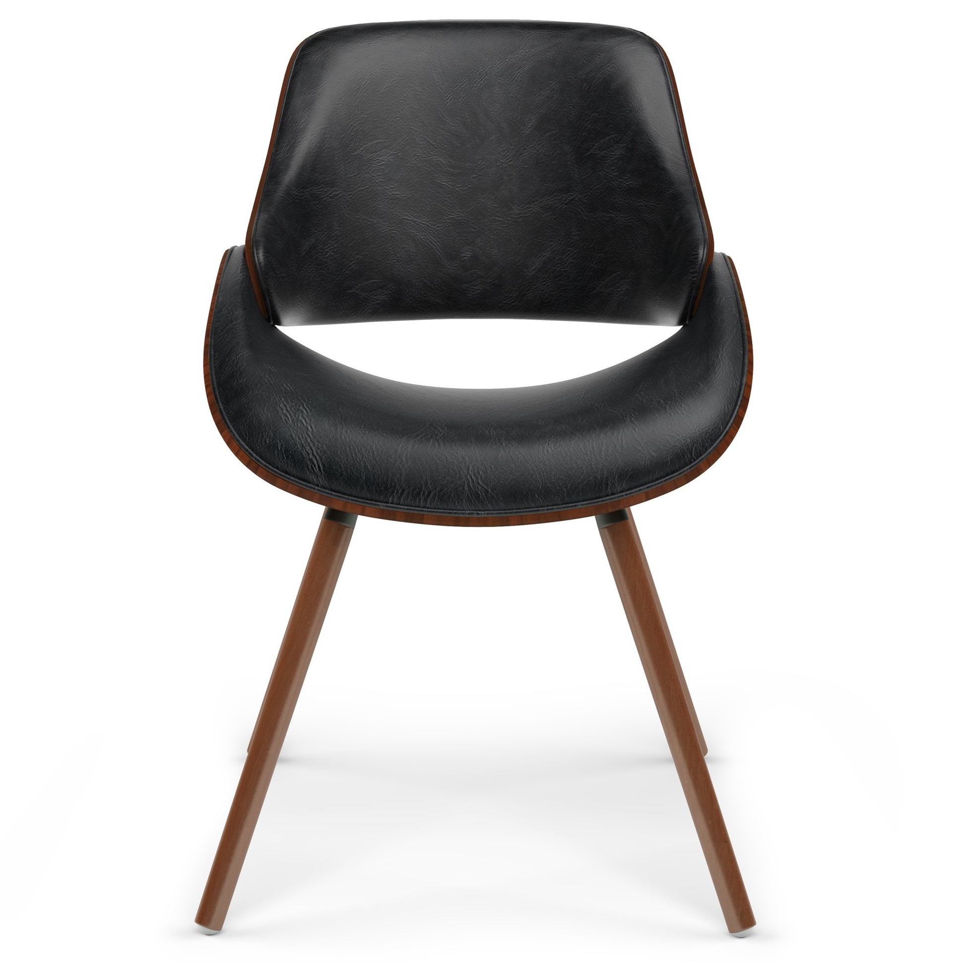 Enhance your dining space with the Malden Dining Chair with Wood Back, featuring a blend of mid-century modern design and contemporary comfort. The gently curved backrest and seat are upholstered in premium vegan leather in black, while the exposed wood backing adds a touch of elegance. Solid wood legs with a walnut veneer provide durability and warmth. Designed with ergonomic contours and high-density foam padding, this chair ensures lasting comfort