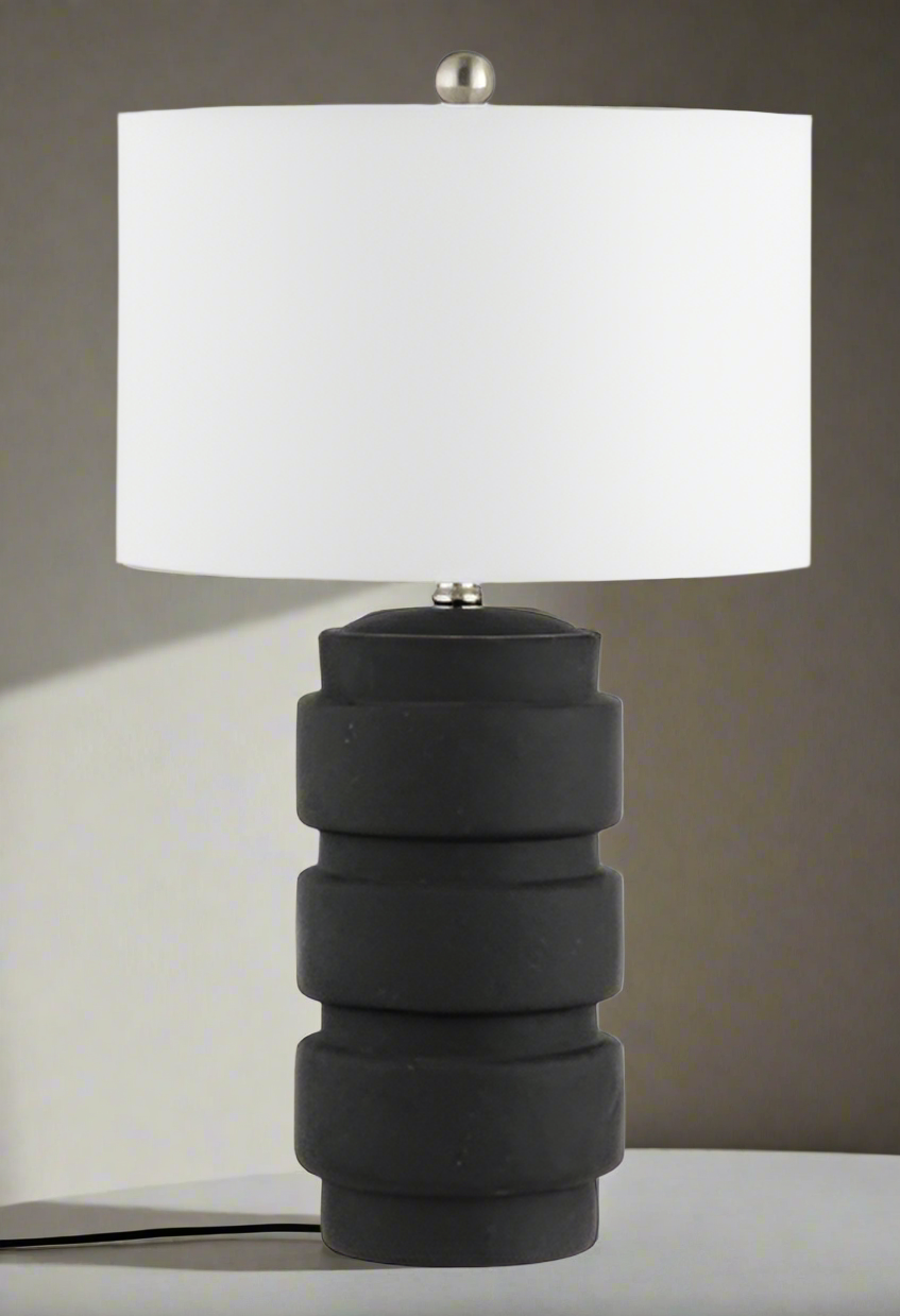 Embrace an irresistibly chic and stylish accent with our Sero table lamp. Cylindrical discs are stacked to attain a sleek and eye-catching base. The bold silhouette and refined details of our table lamp are accentuated with a contrasting black finish and a sleek white drum shade. Lending modern appeal to any corner, our table lamp softly illuminates your console, side table, or nightstand.