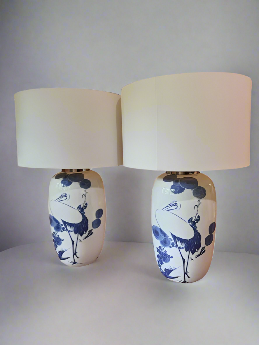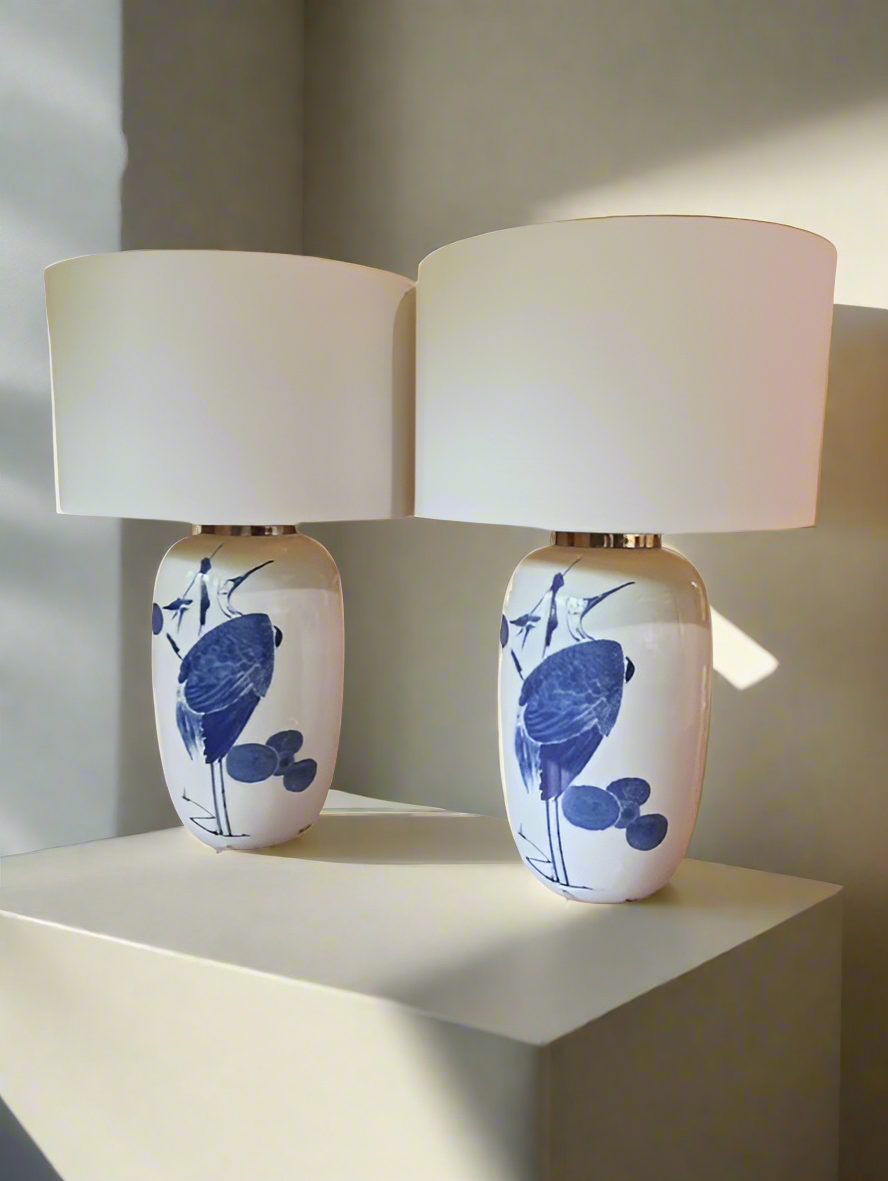 The Regina Andrew Kyoto Ceramic Table Lamp is a modern take on an ancient art form, inspired by the giant cranes often depicted in Japanese calligraphy paintings. The lamp has a white finish, a 3-way switch, and a polished nickel cap and finial. It is available from a number of retailers, including Interior HomeScapes, Lighting Gallery, Topography Home, Ecture, and Cottage and Bungalow