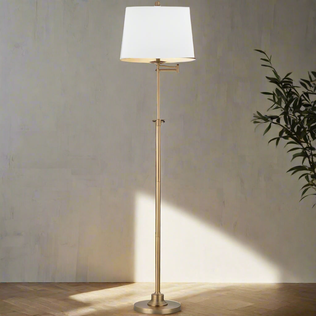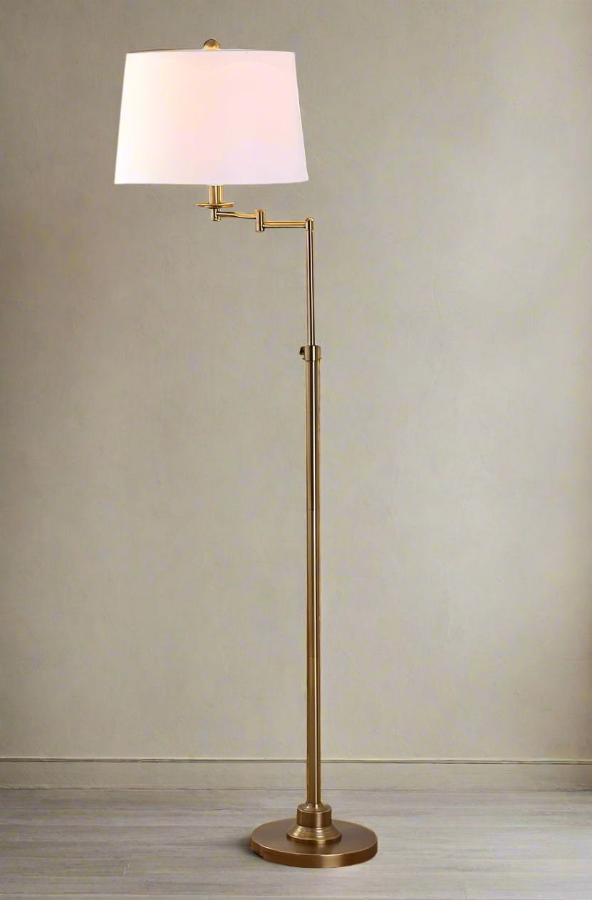 Haute decor for inspired interiors, the Nadia floor lamp embraces the beauty of clean lines and modern, elegant details. Its stylish, gold-finished metal base and swing arm are luxuriant touches highlighted by the soft glow of its white cotton shade.